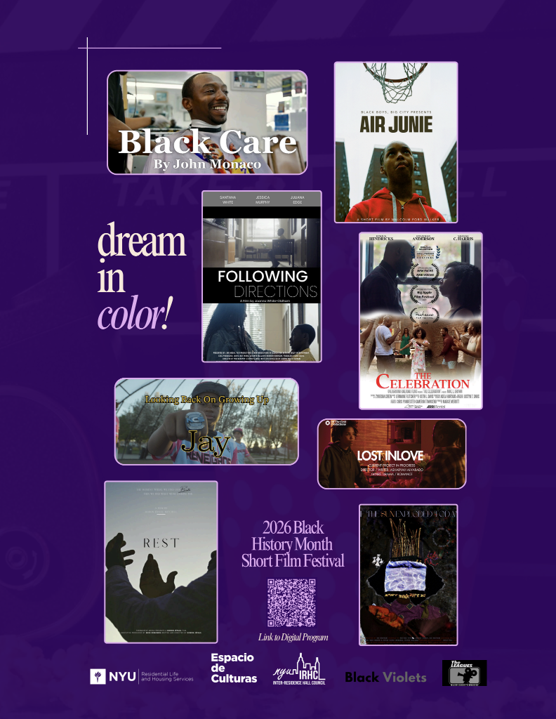 Ready to Dream in Color? Join RLHS, IRHC, The Leagues, and Black Violets to celebrate the work of past, present, and future generations of Black Cinema at NYU. This annual Black History Month Short Film Festival will feature short films from NYU Film students & alum. Light refreshments will be provided. Door Prizes & Giveaways!
