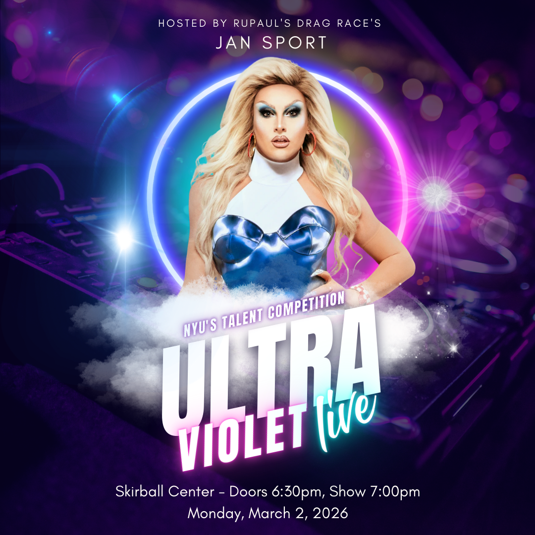 RuPaul’s Drag Race’s Jan Sport hosts NYU’s talent competition UltraViolet Live. 13 top acts compete for cash prizes awarded by industry judges. Monday, March 2 at 7pm in Skirball (doors open at 6:30pm). Join the stand-by line night-of for FREE entry.